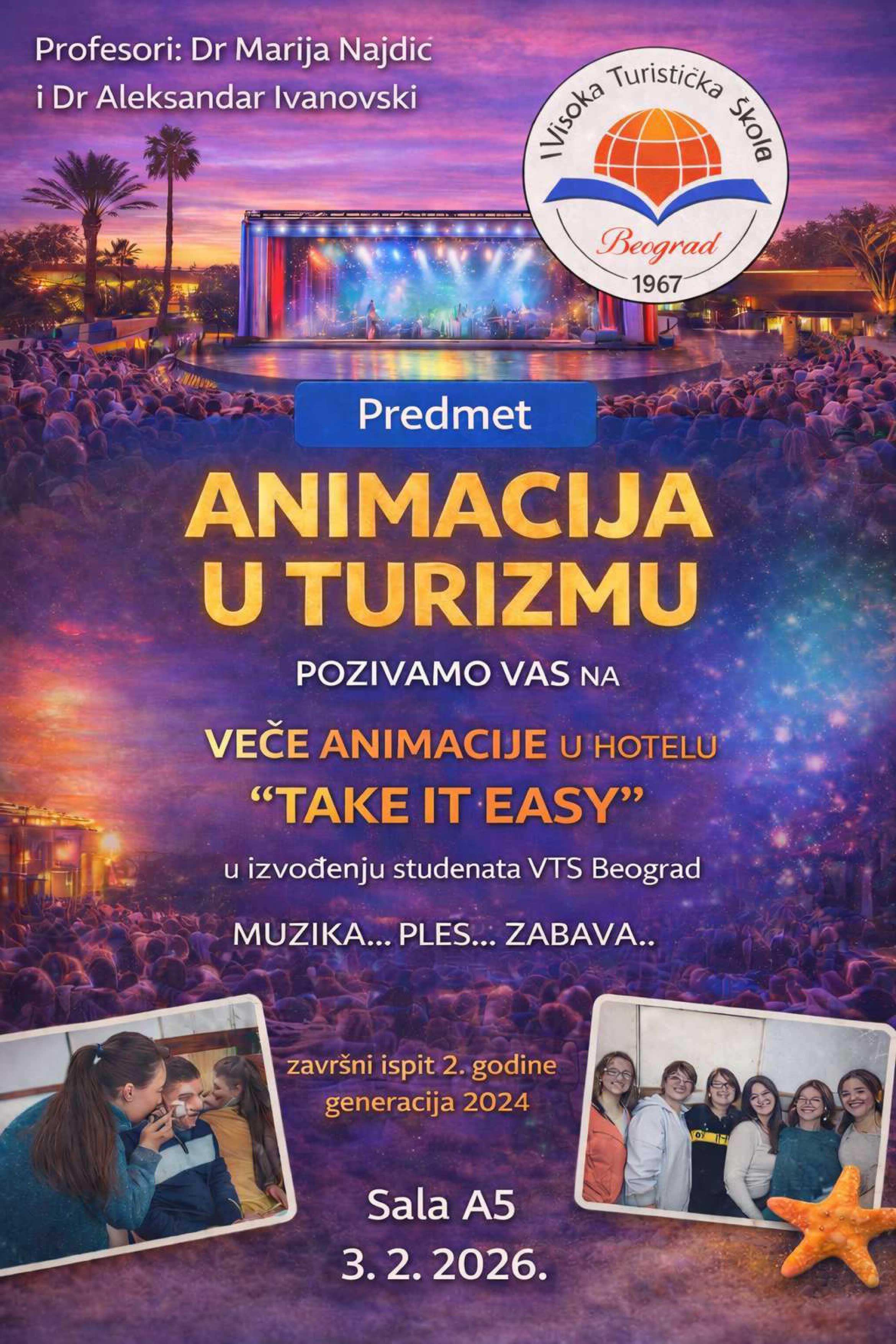 Pozivamo vas na druženje i zabavu u utorak 03.02.2026. u 10 časova, sala A5 u organizaciji studenata II godine studija. Događaj je humanitarnog karaktera osmišljen kao javni nastup iz predmeta Animacija u turizmu sa ciljem prikupljanja donacija za devojčicu Zoju Višekrunu koja je trenutno u Italiji, gde se leči zbog teške aplastične anemije. Kako bi se pomoglo maloj Zoji, potrebno je da se izvrši transplantacija hematopoetskih matičnih ćelija od HLA-haploidentičnog donora.